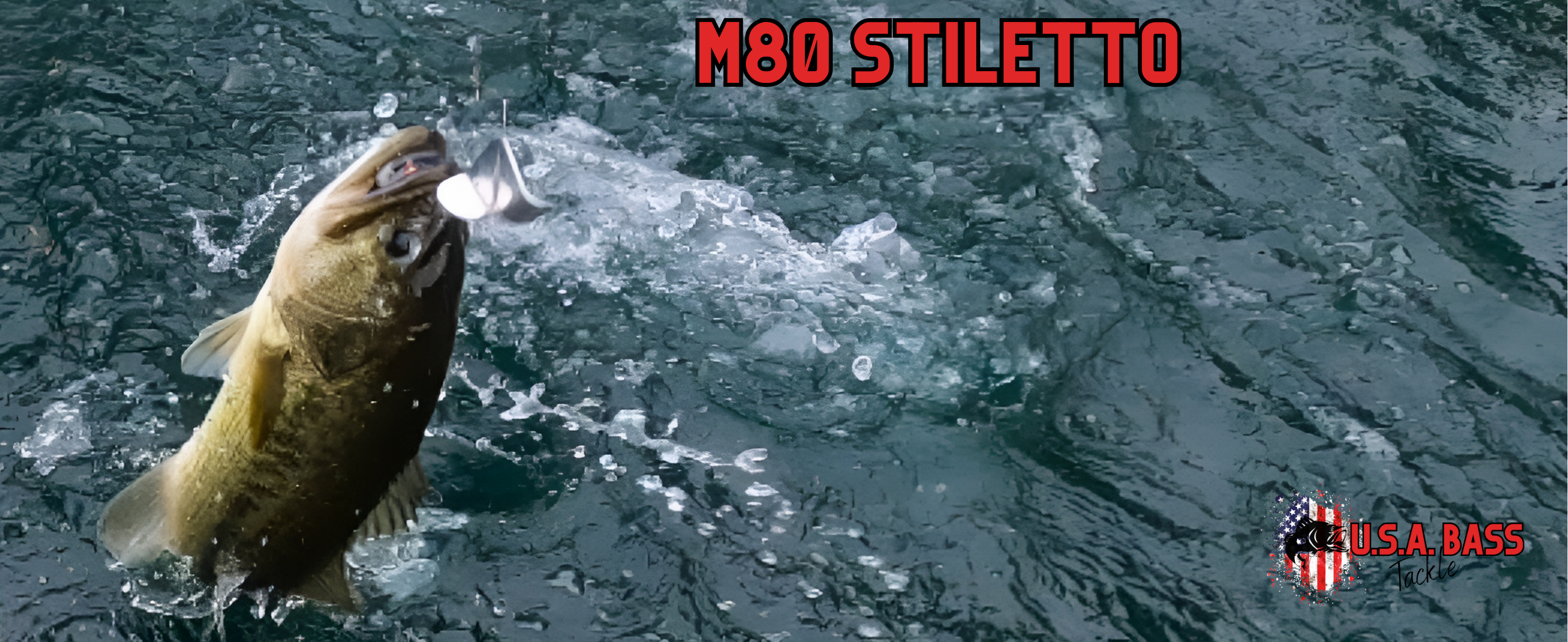The USA Bass Tackle M80 Stiletto is a 1/2 ounce wire buzzbait made for attracting fish from a distance. Crafted with thick gauge stainless steel wire and a long custom silicone skirt, its rolling clacker on the lower shaft calls fish from far and wide. At the top is a large Hover-Prop with a powerful wave-making design, inspired by military hovercraft for its ability to weave through lily pads and other aquatic plants. Its unique shape delivers nimble recovery from brush and branches, allowing you to bushwhack with uncanny ease as you work this bait through all types of cover. An excellent choice for spotted bass, largemouth, smallmouth and more, the Stiletto's distinctive clacking and surface commotion is hard for fish to resist.