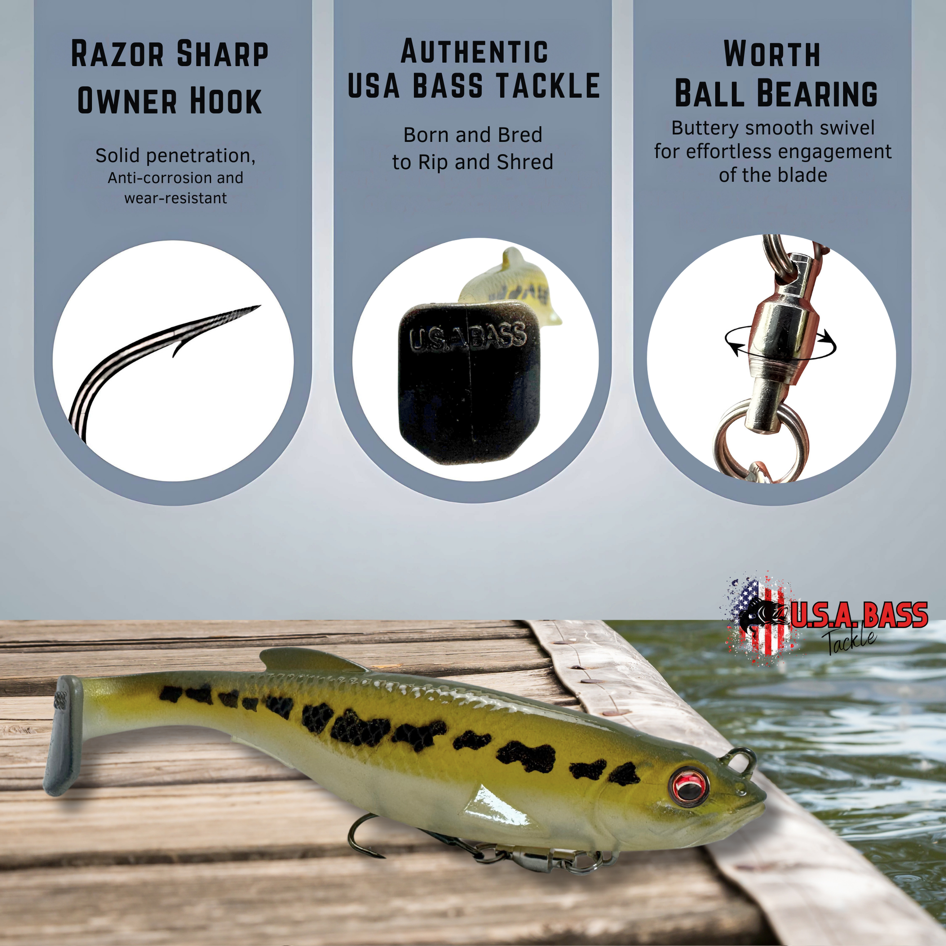 A Big Bait for Big Fish! The U.S.A. Bass Tackle Magnum Swimbait is a premium paddle tail swimbait made for professional anglers and serious fishermen. It is pre-rigged with a heavy duty saltwater grade Owner hook, internal spring magnet and internal weight. The Magnum is rigged with an Owner Mega Free Swinging Stinger Treble hook and features a paddle tail design that produces a life-like swimming action in the water. This swimbait is ideal for fishing in freshwater and saltwater. It is available in a variety of popular colors that include trout, shad, ghost and bone. The U.S.A. Bass Tackle Magnum Swimbait is designed with a realistic 3-D eye and a detailed paddle tail that make it look like a large baitfish, shad, rainbow trout, hitch or minnow. This bait is perfect for fishing in shallow or deep water and can be used in a variety of fishing techniques. It is a great choice for fishing in ponds, lakes, rivers, and streams. The U.S.A. Bass Tackle Magnum Swimbait is made with Bass-Tech high-quality materials that make it durable and long-lasting. It is designed to resist damage from rocks, branches, and other debris in the water. This swimbait is also scented to attract fish.