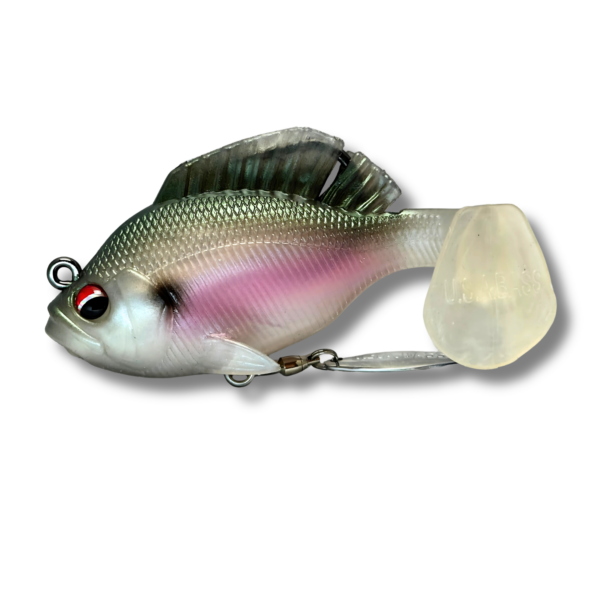 This is a USA Bass Tackle Hand Poured Underspin Gill - Weedless Gilly Paddletail Swimbait with a Bass-Tech Soft Plastic and Owner Mega Jig Hook. It is designed for largemouth, smallmouth, spotted bass and other predator fish. It is a weedless bass design with a paddle tail that creates a natural swimming action. The gill plate provides an irresistible target for fish to strike. The jig hook is strong and sharp with a wide gap to secure the bait. The hand poured body is highly detailed and realistic. The package includes 1 bait